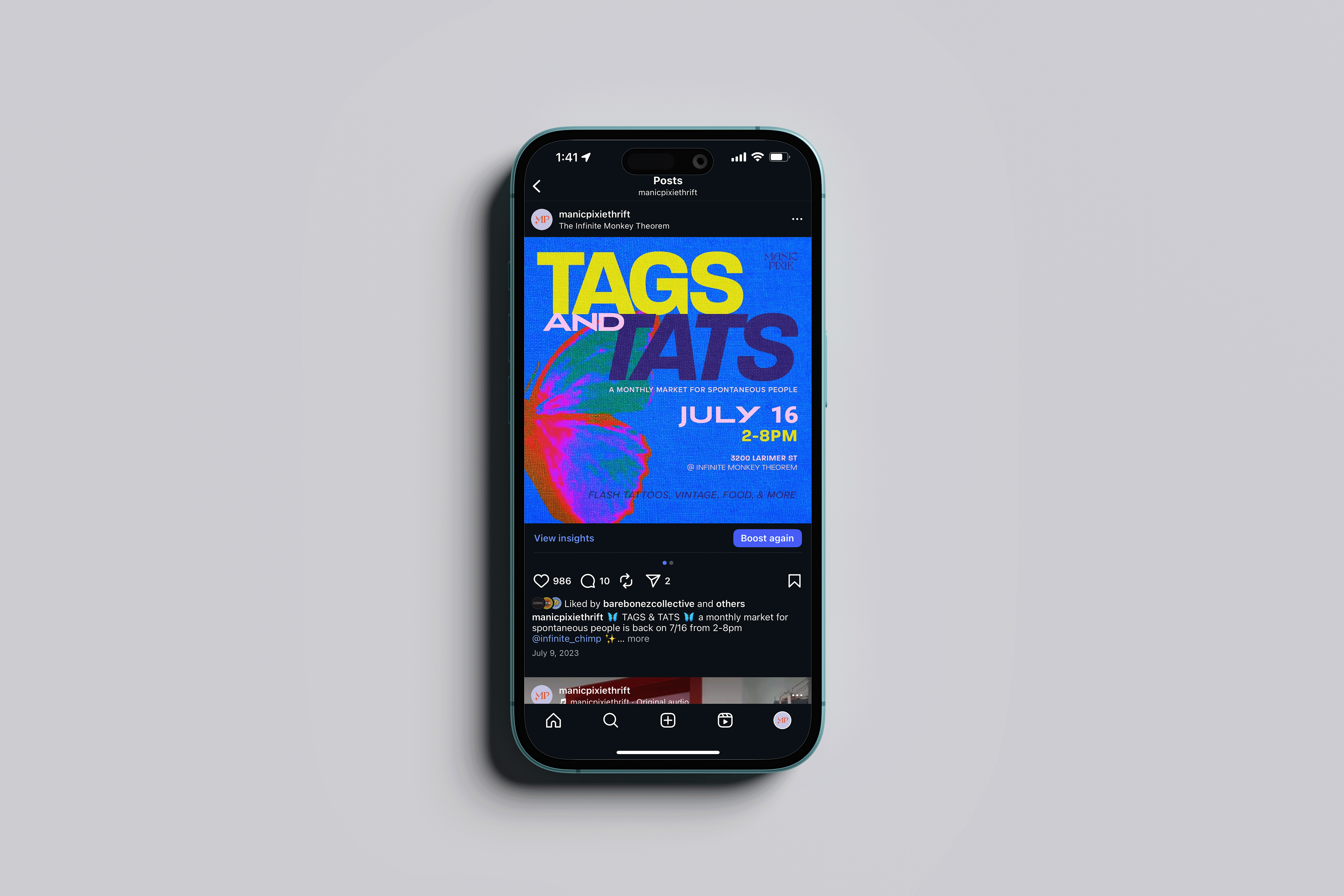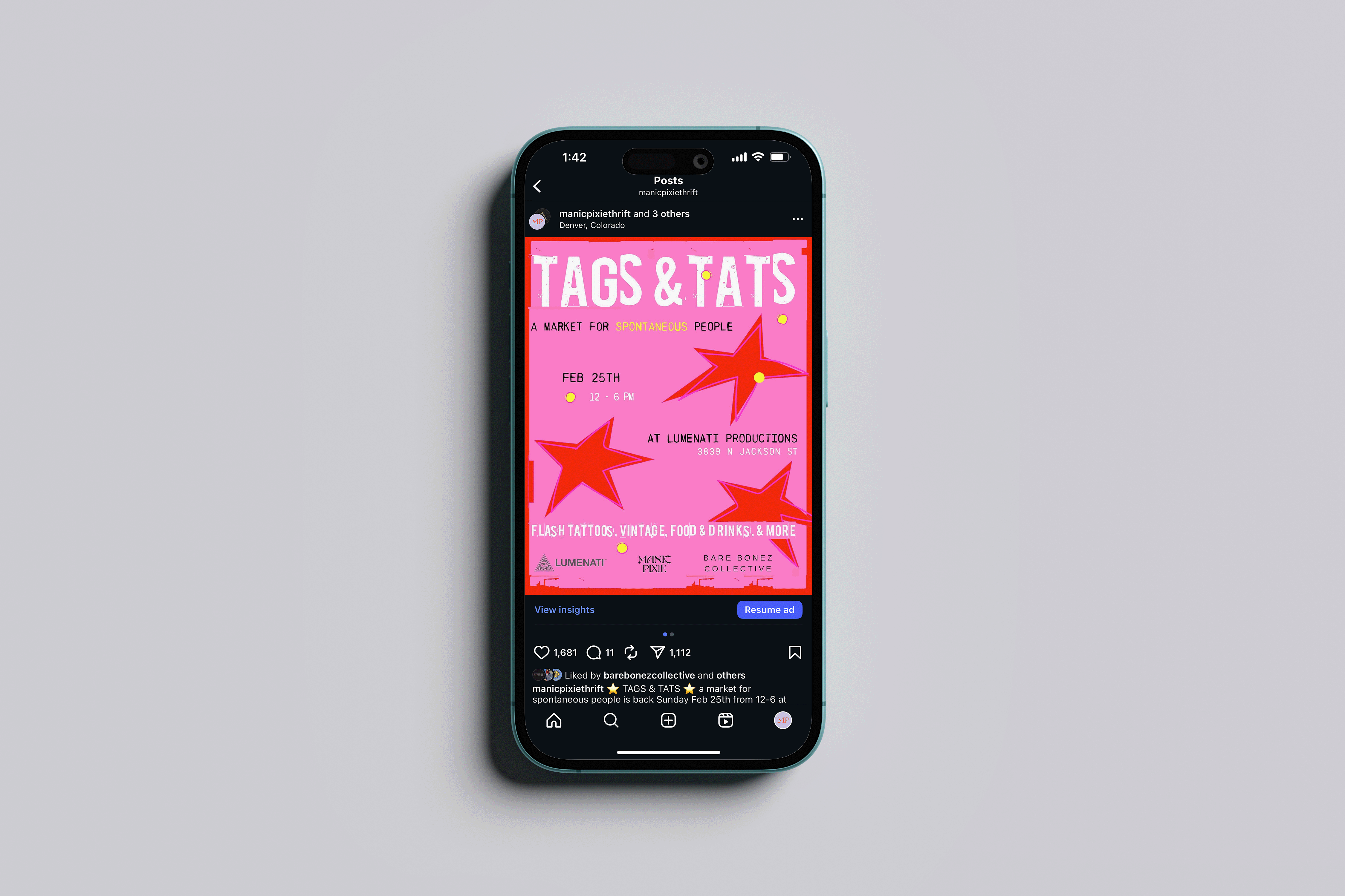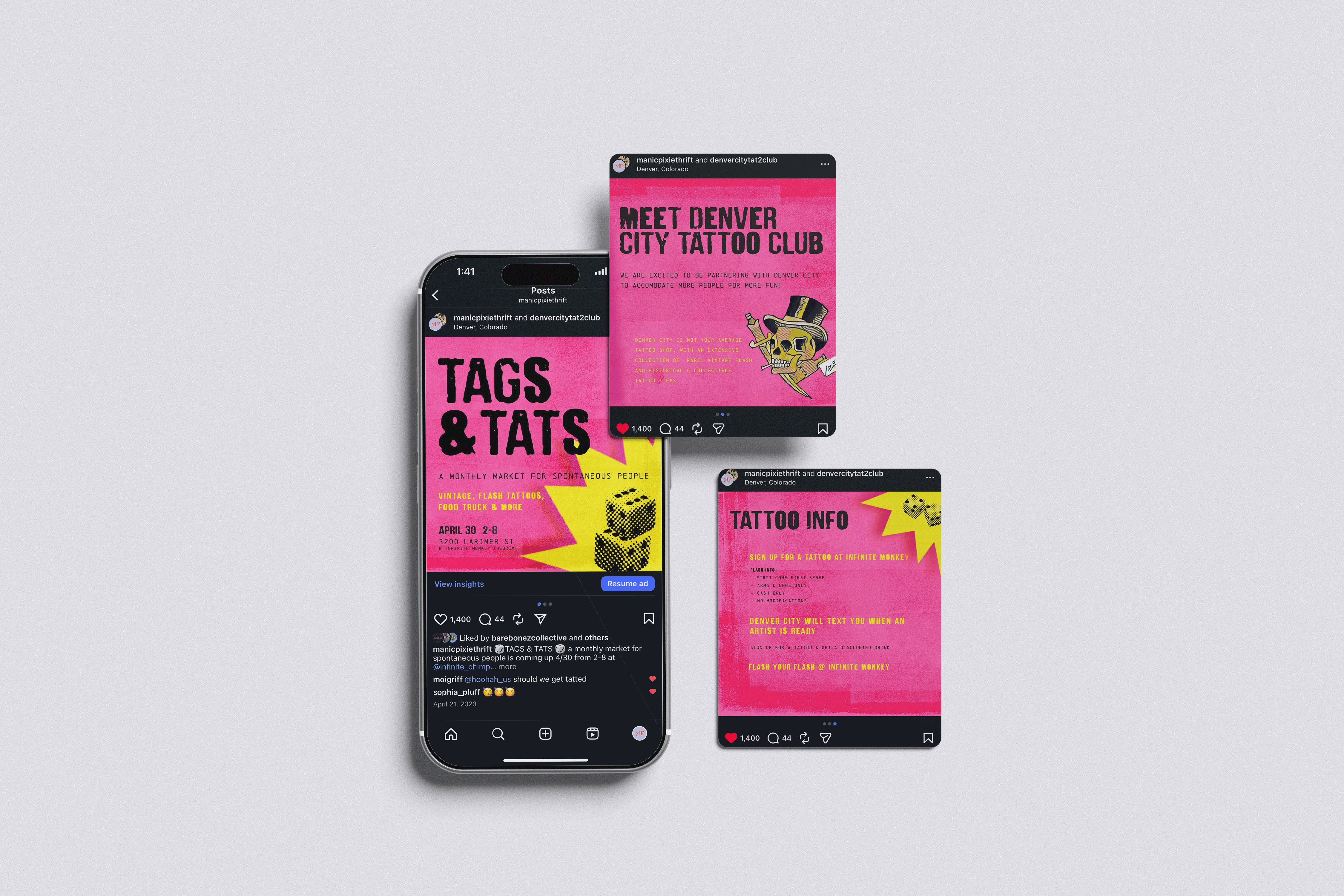 Tags and Tats is a spontaneous market for spontaneous people in Denver. The event consists of flash tattoos, vintage clothing, handmade jewlery, and more. Focused on engaging the community to get excited about supporting local businesses.